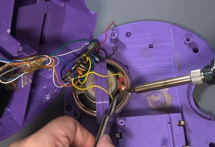 作業のためあらかじめ外したパーツや線をはんだ付けし、電池を入れてみてどうなるかを試してみます。!