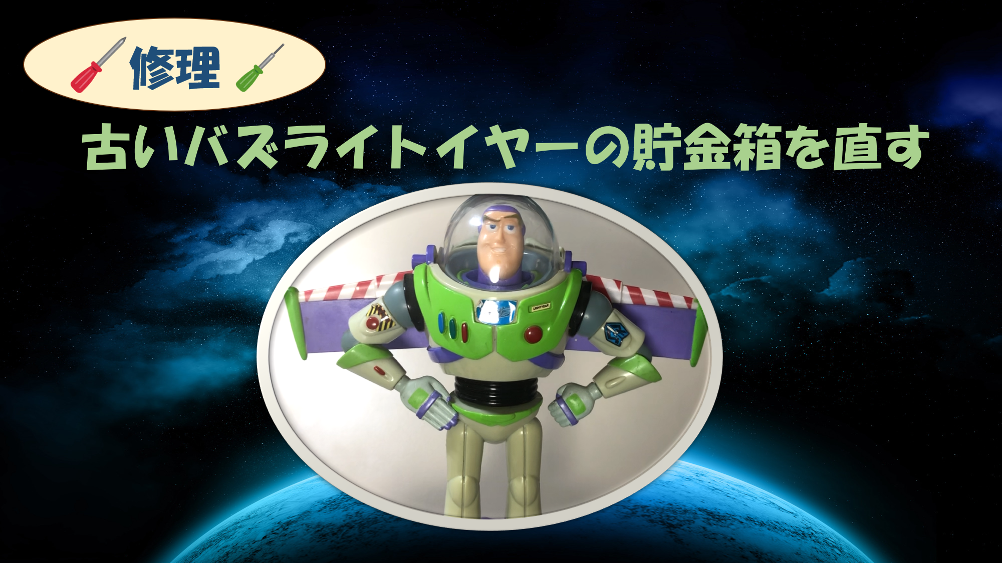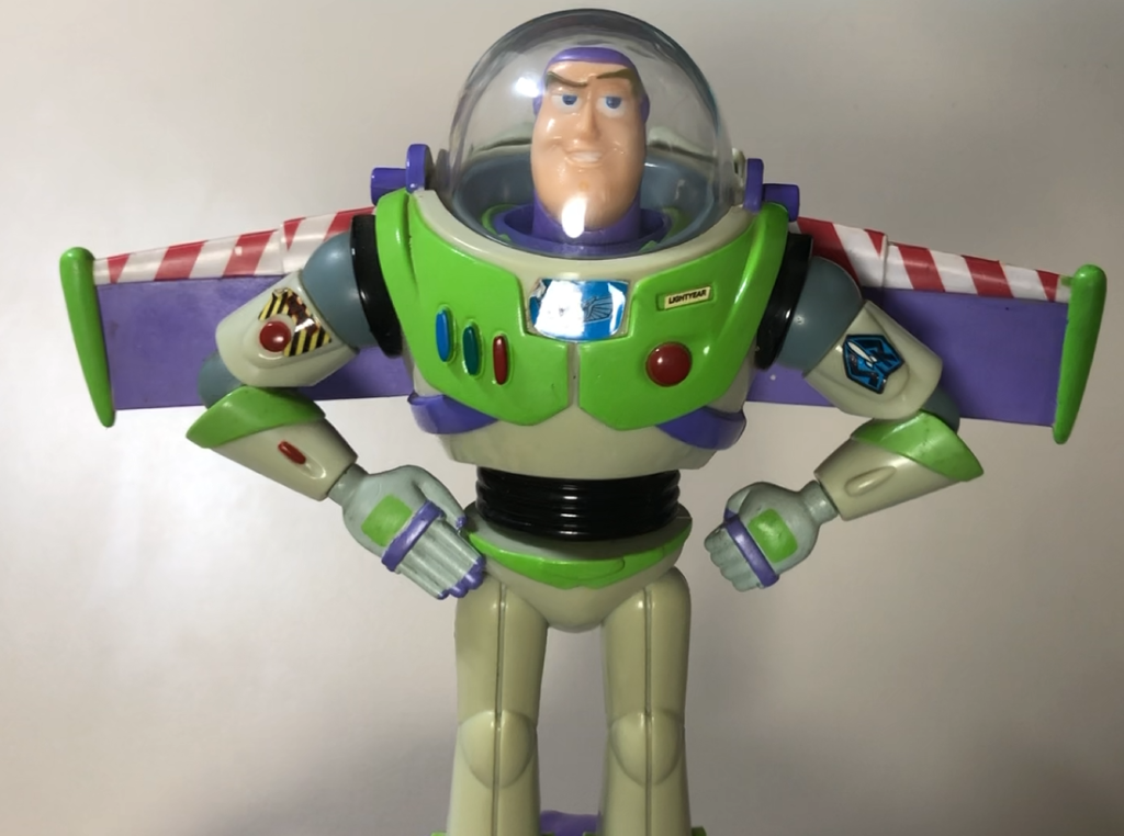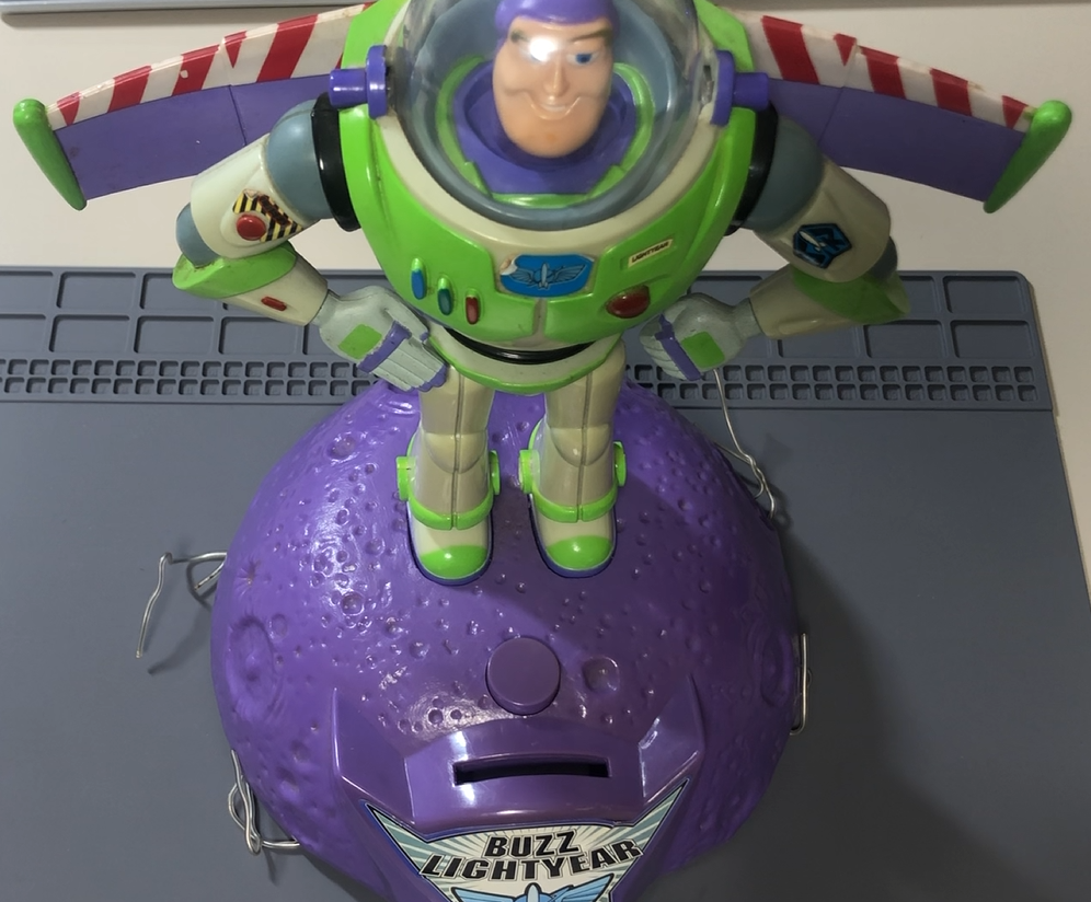 今回はこのバズライトイヤーの貯金箱を修理していきます。
